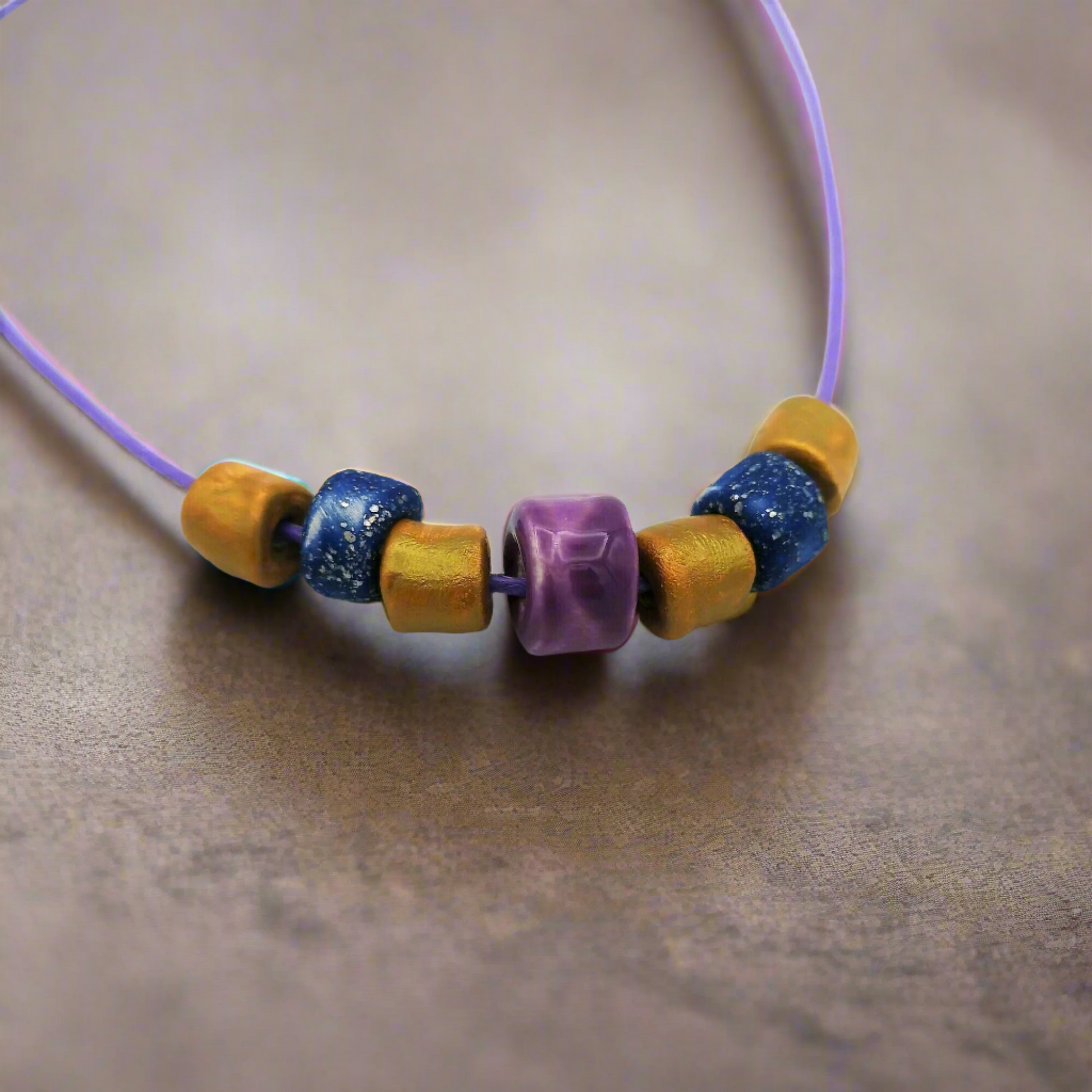 Introducing our 🌟 Everyday Necklace 🌟, a stunning piece of jewelry that adds a touch of color and elegance to any outfit. Hand-rolled and hand-dyed, this trendy beaded necklace features golden, blue, and lilac ceramic beads on a lilac cord, making it a perfect accessory for any occasion.