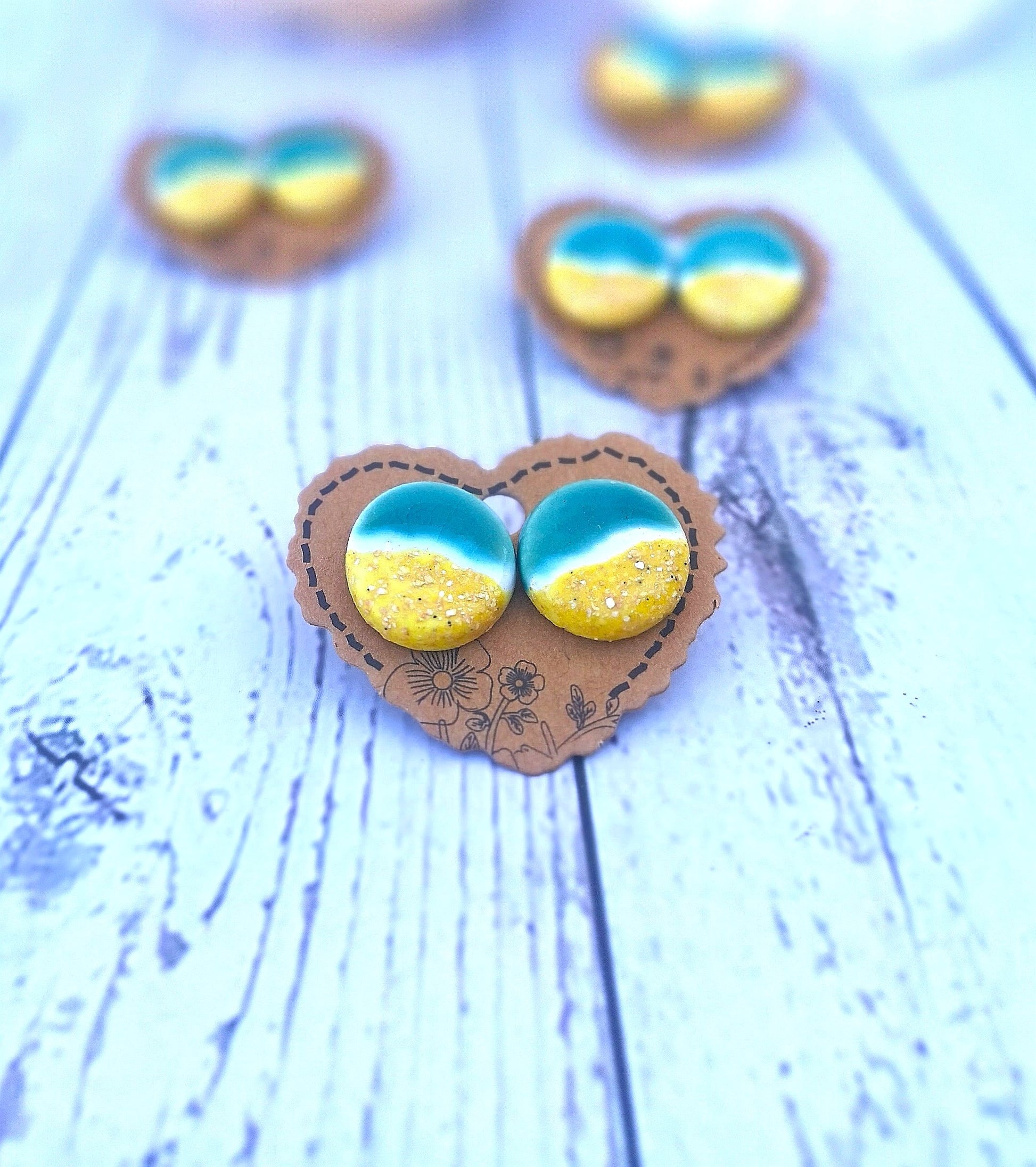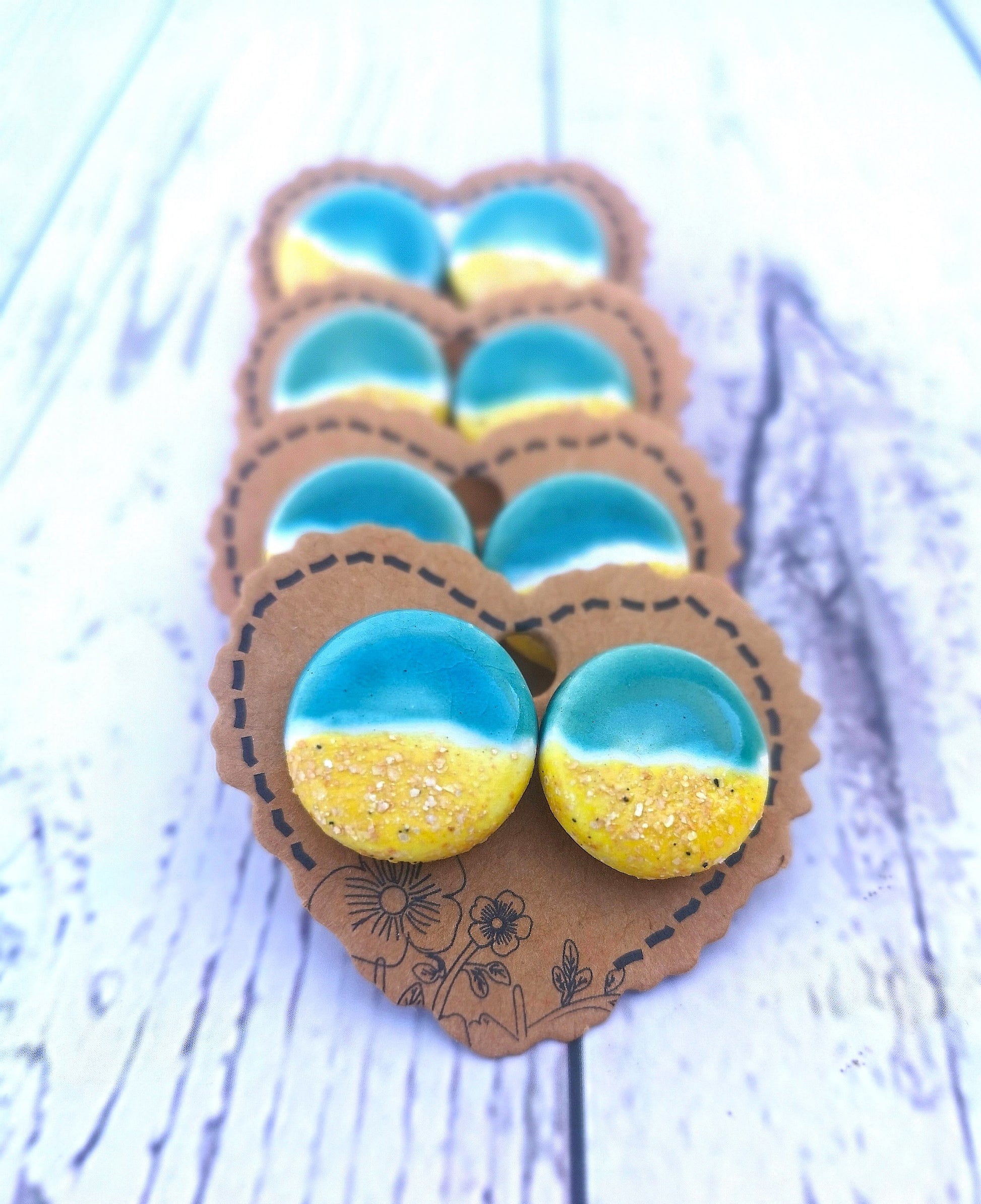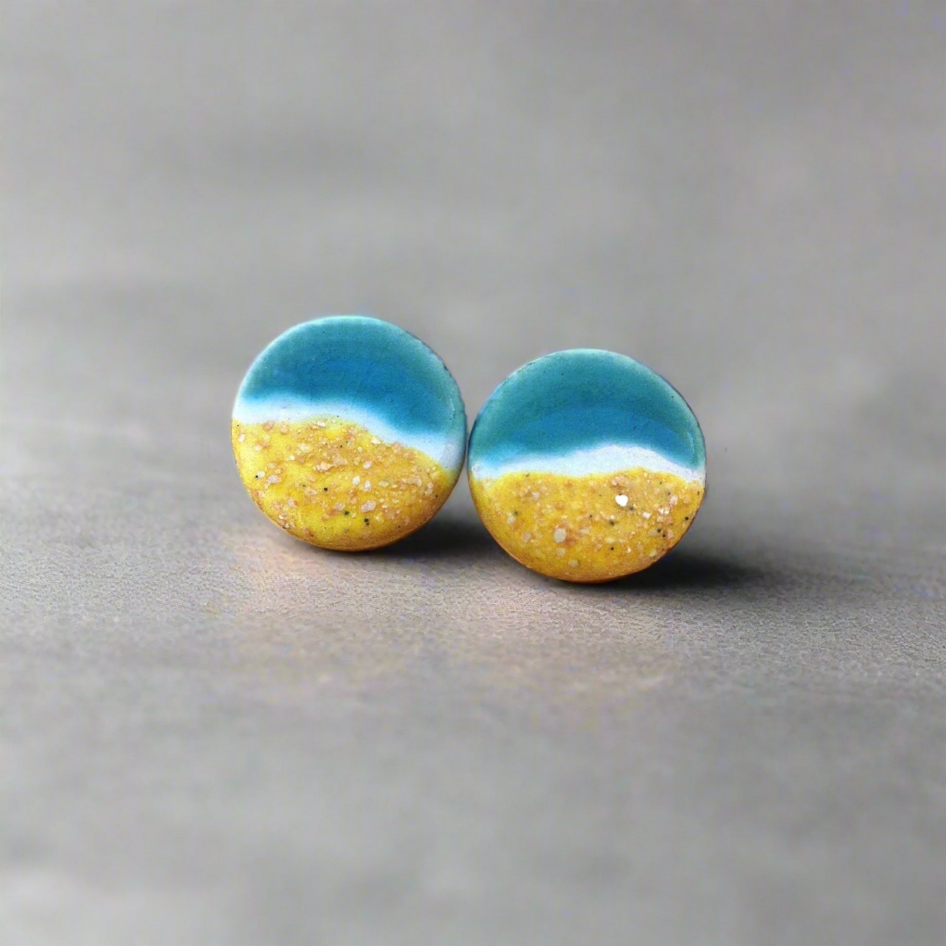 Immerse yourself in the serene beauty of the ocean with these handmade ceramic beach earrings. These 20mm round earrings capture the tranquil colors of the sea, featuring stunning shades of blue and sandy tones. Perfect for beach lovers, they add a touch of coastal boho charm to any outfit.