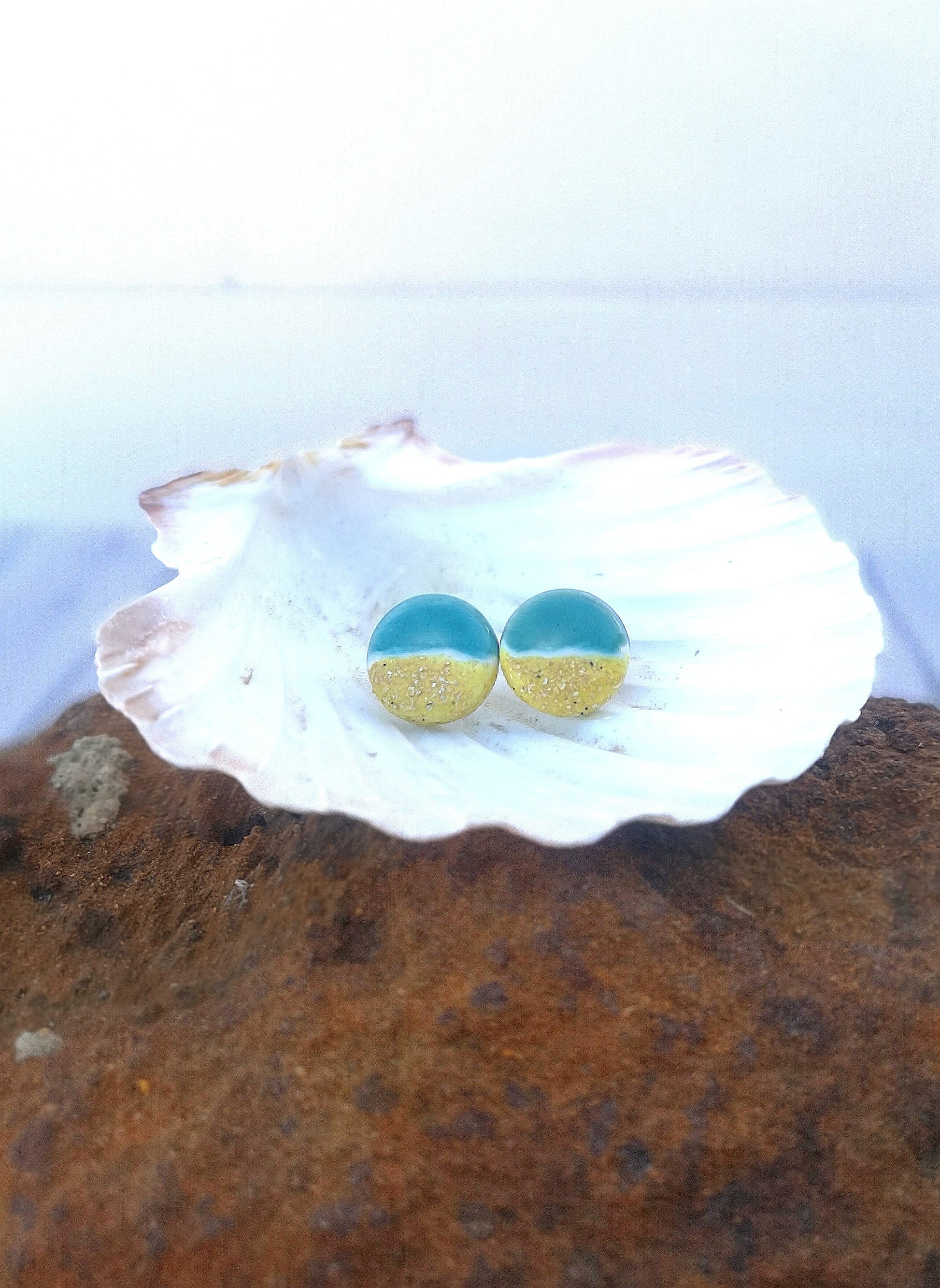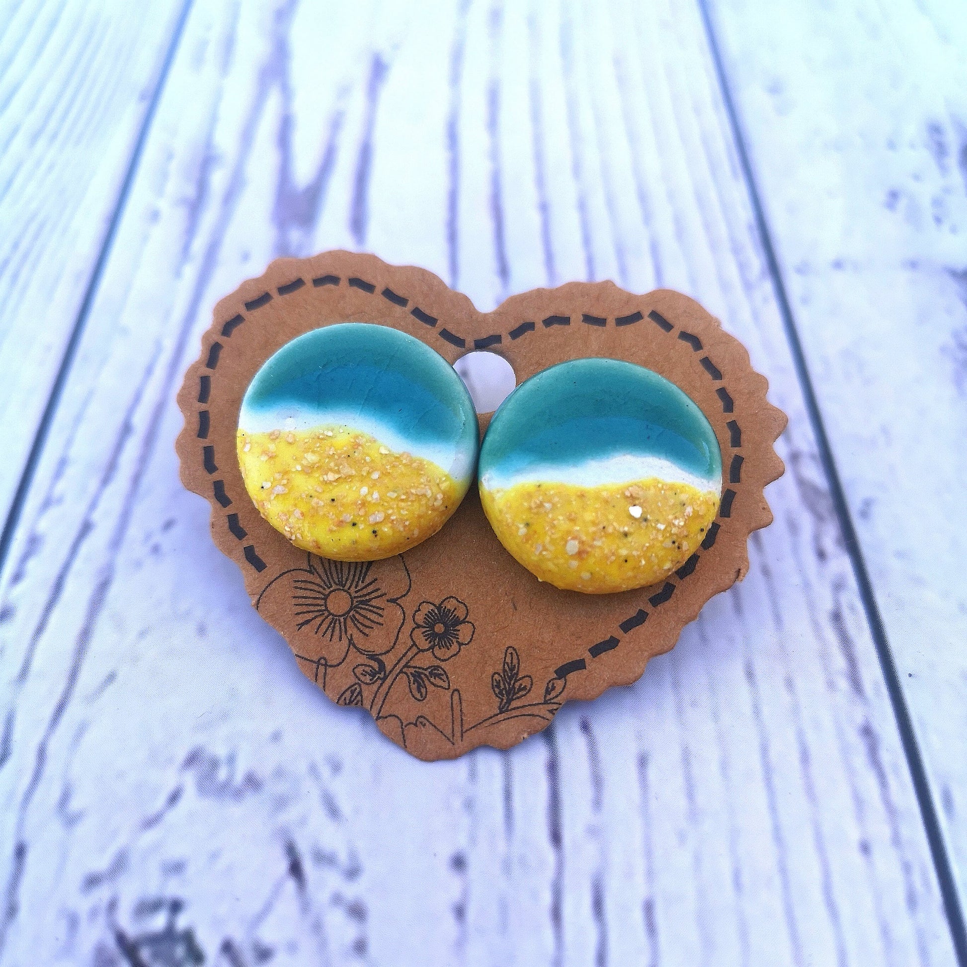 Handmade Ceramic Beach Earrings, 20mm Round Ocean-Inspired Studs, Boho Artisan Jewelry Gift