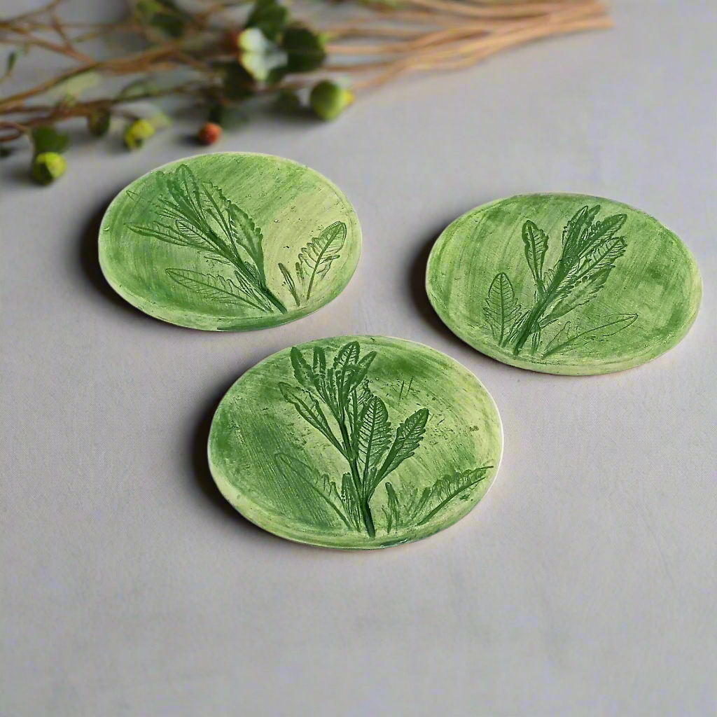 Add a natural and elegant touch to your home with this beautiful set of handmade ceramic coasters featuring a unique pressed green lavender leaf design. Carefully crafted and hand-painted in soft brown tones, these round coasters are a blend of functionality and organic charm.
