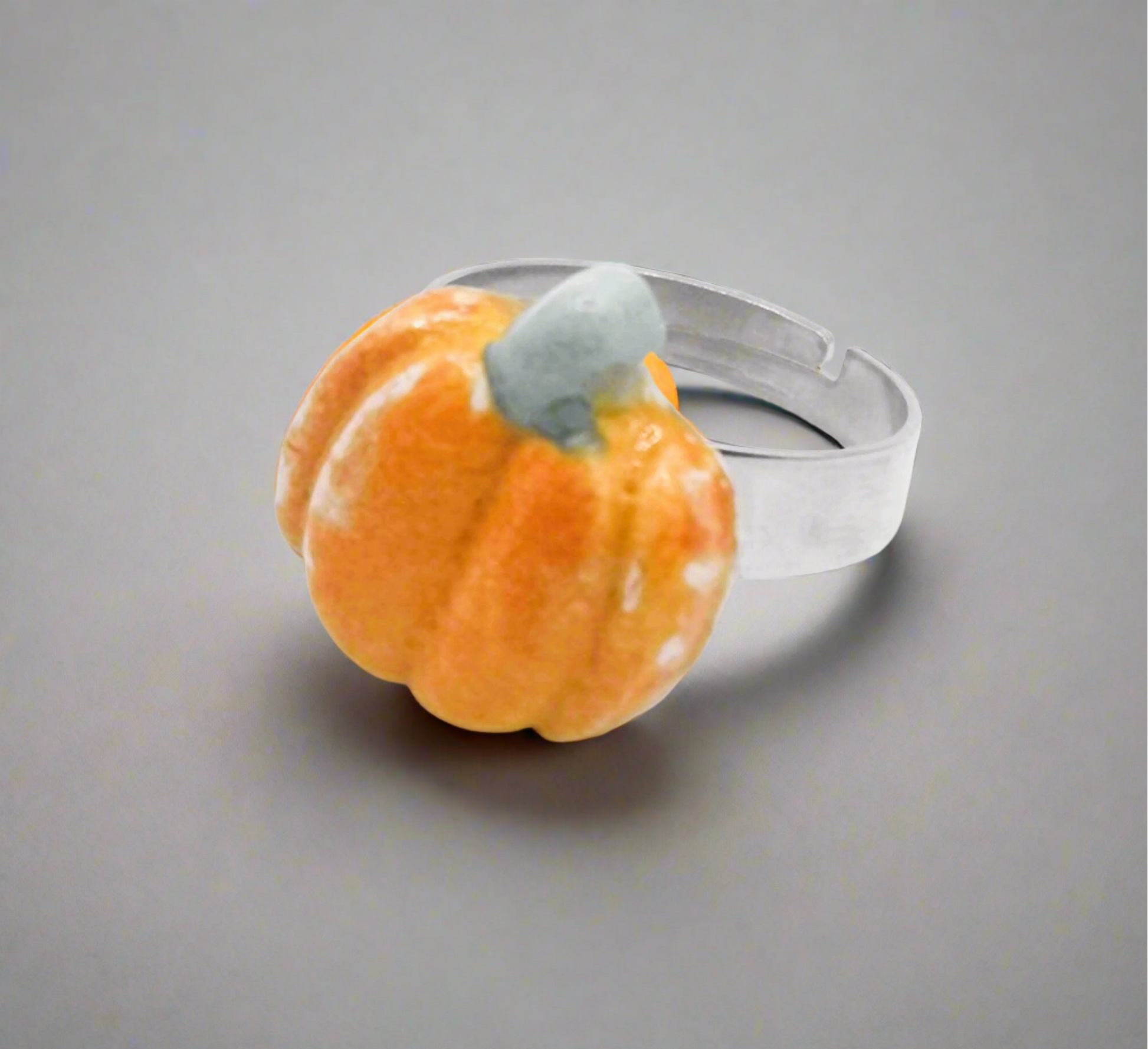 Handmade Ceramic Orange Pumpkin Statement Ring For Women, Stainless Steel Adjustable Ring For Halloween, Porcelain Fall Gifts For Her