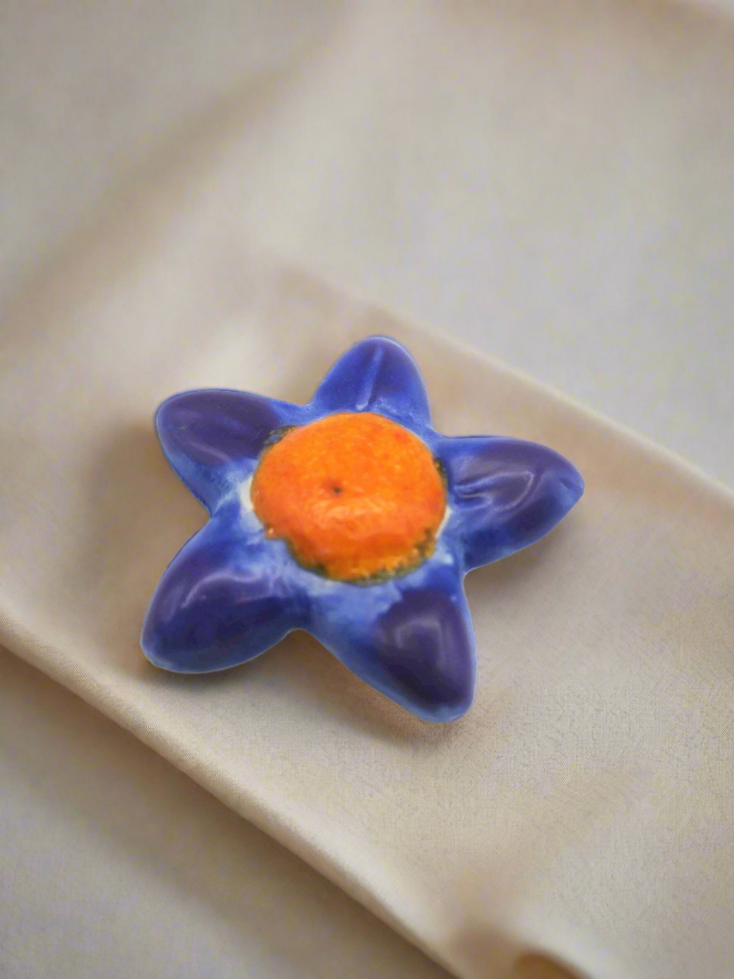 This large flower brooch for women is a lovely gift for her, featuring a blue and orange glazed ceramic star. Happy and colorful, my ceramic pin would make a stunning addition to hats, lapels, backpacks, and more! Add some more sunshine to your life today!